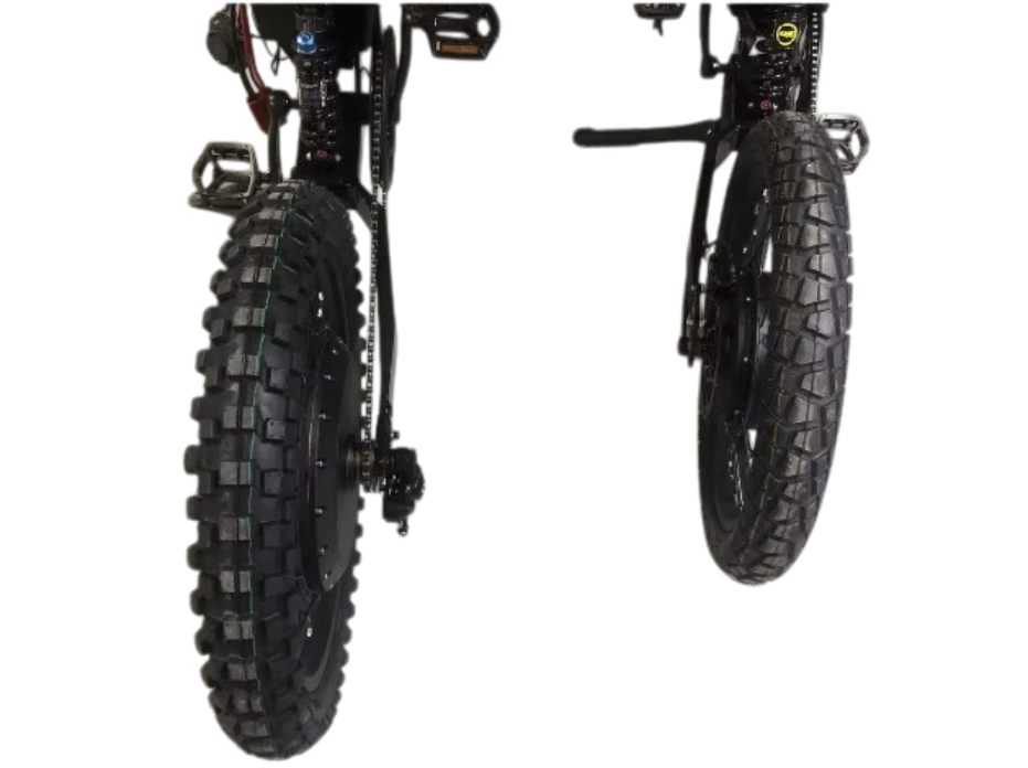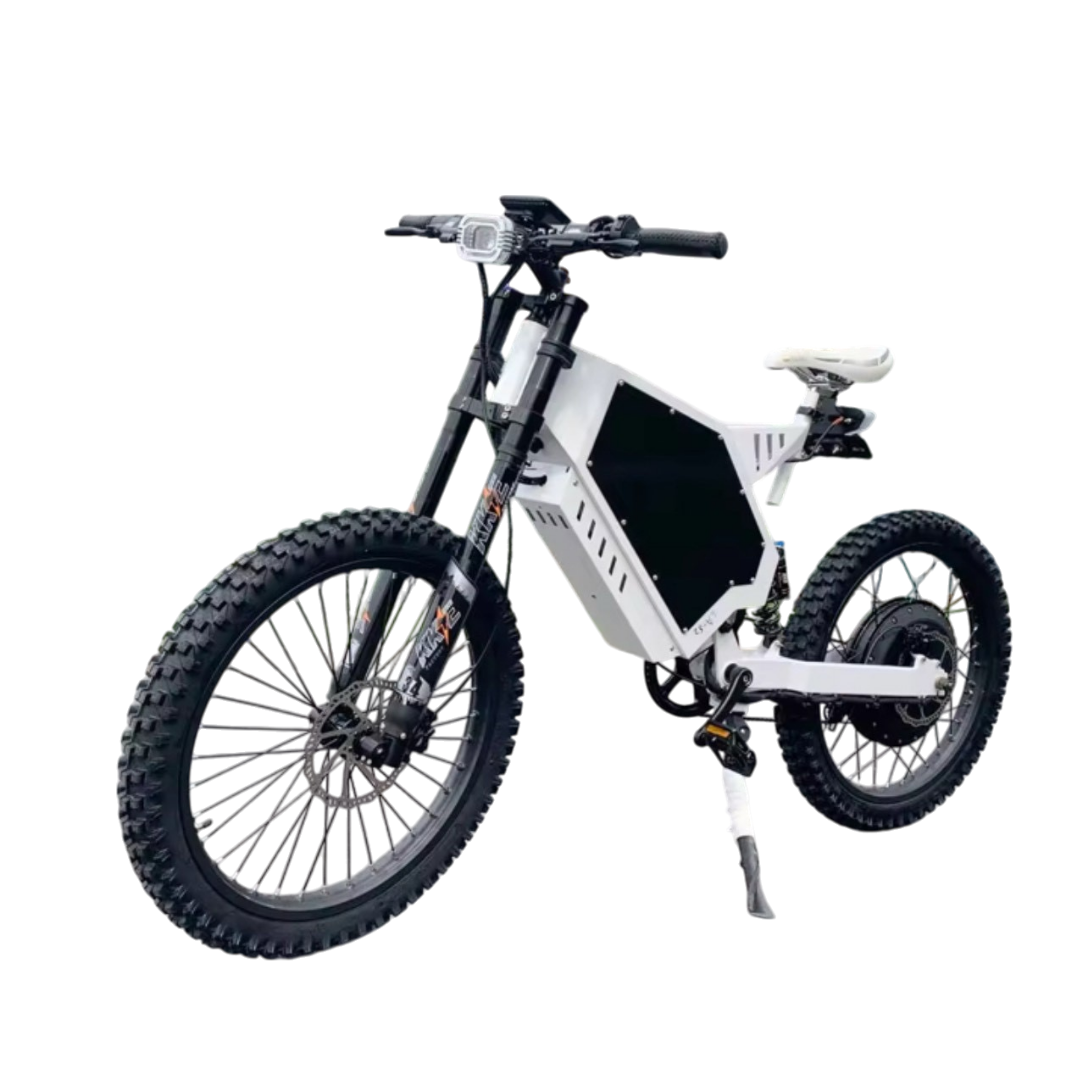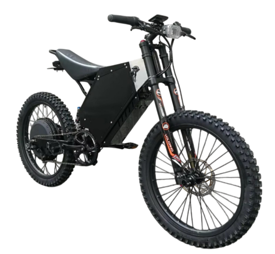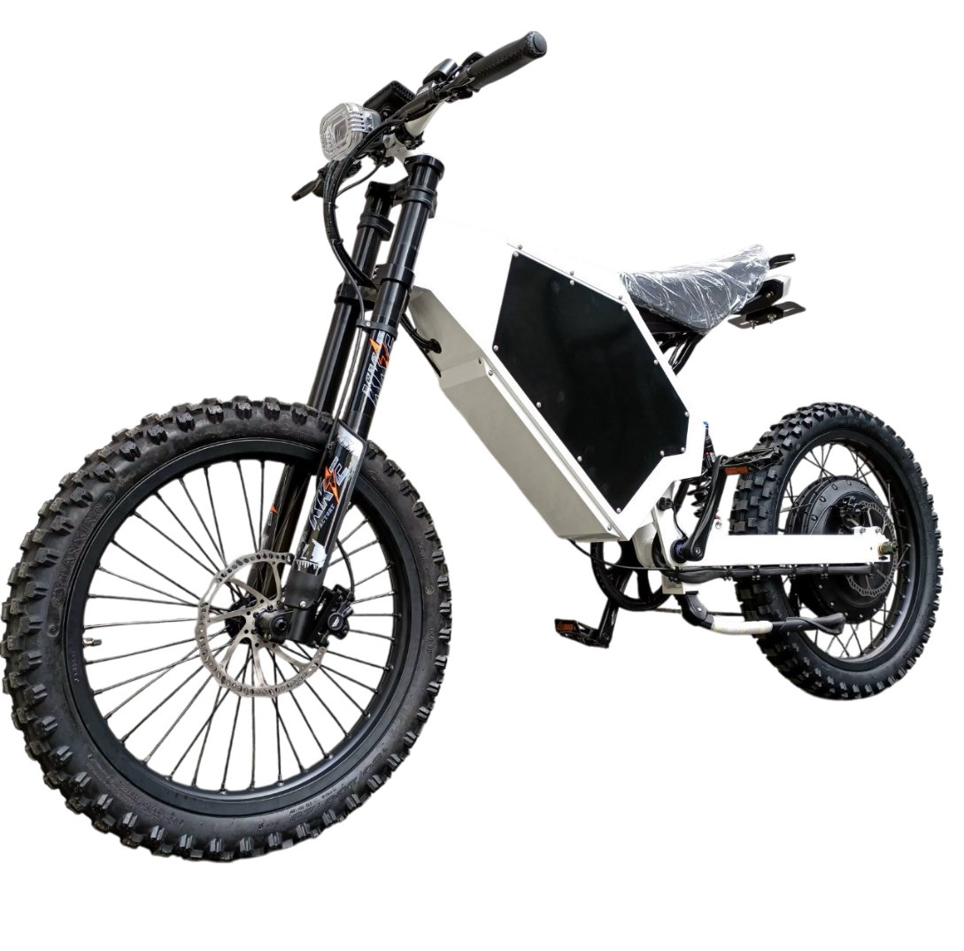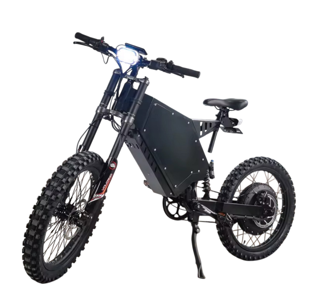 Unleash unparalleled power with the Amp-X Electric 72V 12000W Stealth Bomber, a high-performance electric bike engineered for thrill-seekers and off-road enthusiasts. Equipped with a robust 72V 8000W motor and a 72V 40Ah lithium battery, it delivers exhilarating top speeds of up to 140 km/h and a range of 70–75 km on a single charge. Designed for rugged terrains, the Stealth Bomber features a full suspension system with a KKE/DNM front fork and KKE/DNM rear shock, enabling you to tackle any terrain. The bike is equipped with Tektro hydraulic disc brakes for immense stopping power and a display that provides real time performance data.