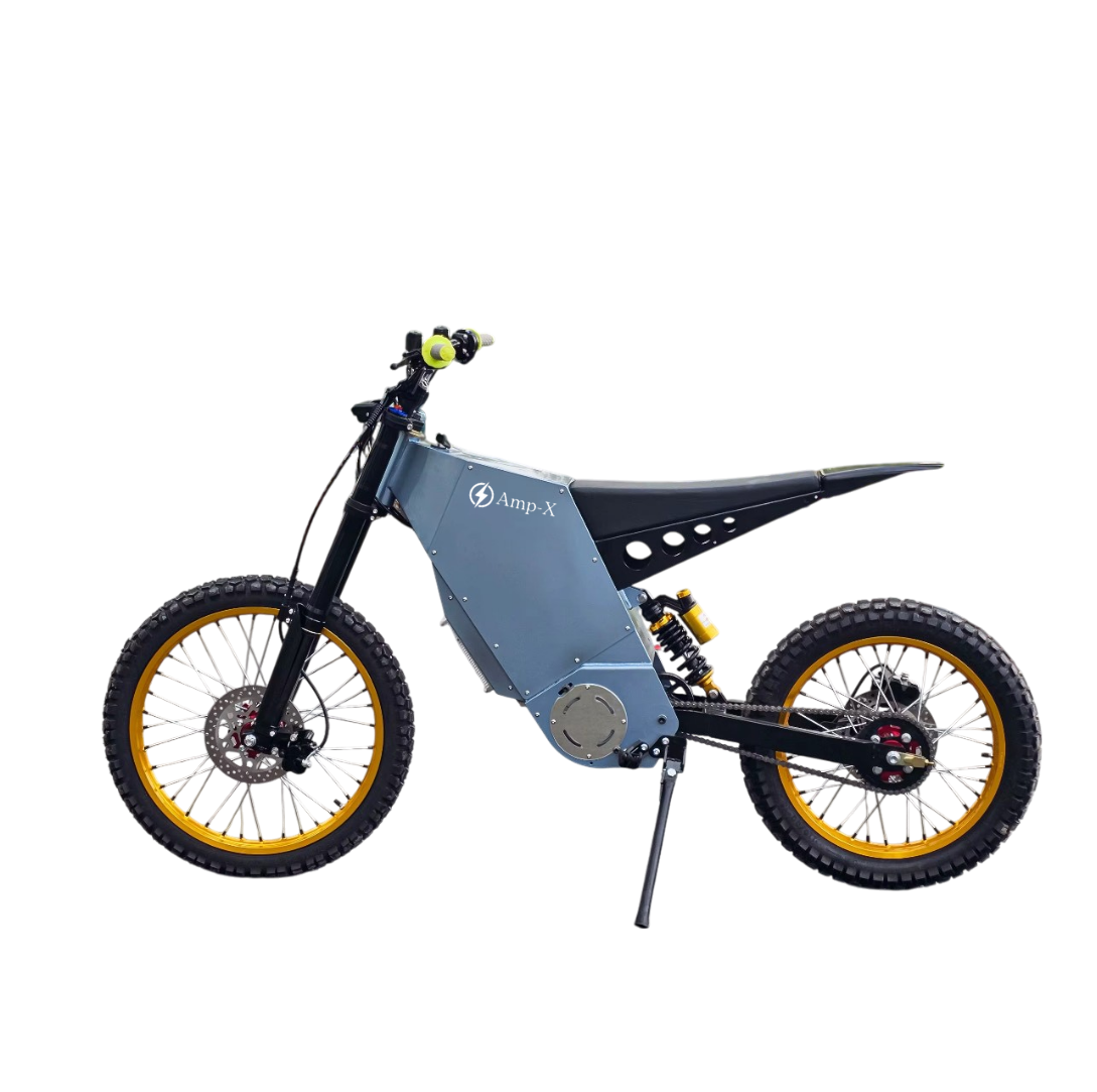 The Amp-X Electric mid drive stealth bomber, with its robust design, is engineered for unparalleled performance. It is made of a durable carbon steel frame with motorcycle forks/shock and is paired with moto breaks which provide ample stopping power. Equipped with a 10/15KW motor + encoder and driven by a 150/200a far driver controller, it delivers unmatched torque. It's powered by a high capacity 72v 70ah lithium battery that through our innovative design maximizes efficiency, yielding 200km of range.